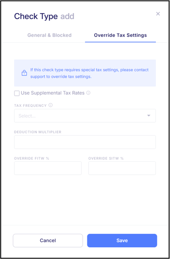 Once all settings are configured accordingly, click on the "Override Tax Settings" tab to review and configure the Check Type's tax settings.