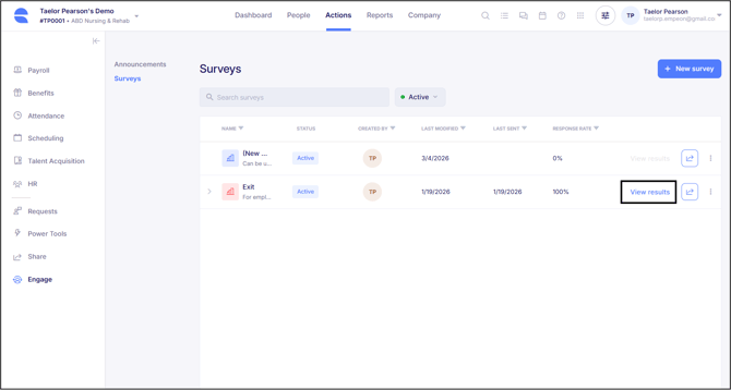 Once a Survey has been sent to employees, it's important to ensure that the questions within the Survey are completed within a timely manner. To view the ongoing and submitted progress of Surveys that have been shared, navigate to the Engage section within the Actions tab and select the Surveys tab.