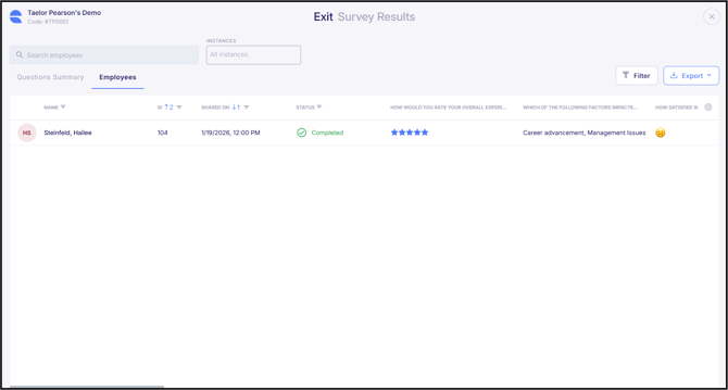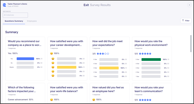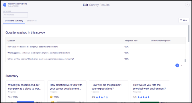 When viewing the results of a Survey that has been shared, there are two review tab options available - Questions Summary and Employees.